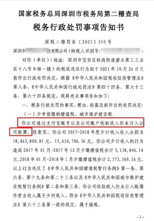 深圳某科技公司,通過支付寶賬號以及公司賬號收取收入,導致少計收入3411.85萬元,造成少繳增值稅571.24萬元以及城市維護建設(shè)稅。此外,稅務(wù)局通過核定征收的方式,查明該公司少繳企業(yè)所得稅37.43萬元。最終,上述公司被處百分之五十的罰款,共計3243277.46元。